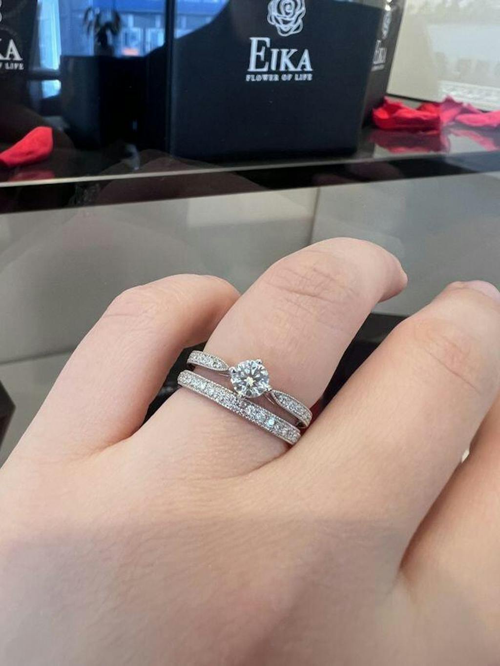 全国の平均は約0.3カラットですが、EIKAでは「見た目の華やかさ」と「デザインの映え」を兼ね備えた0.5カラットが人気で、プロポーズ用としておすすめのサイズです。