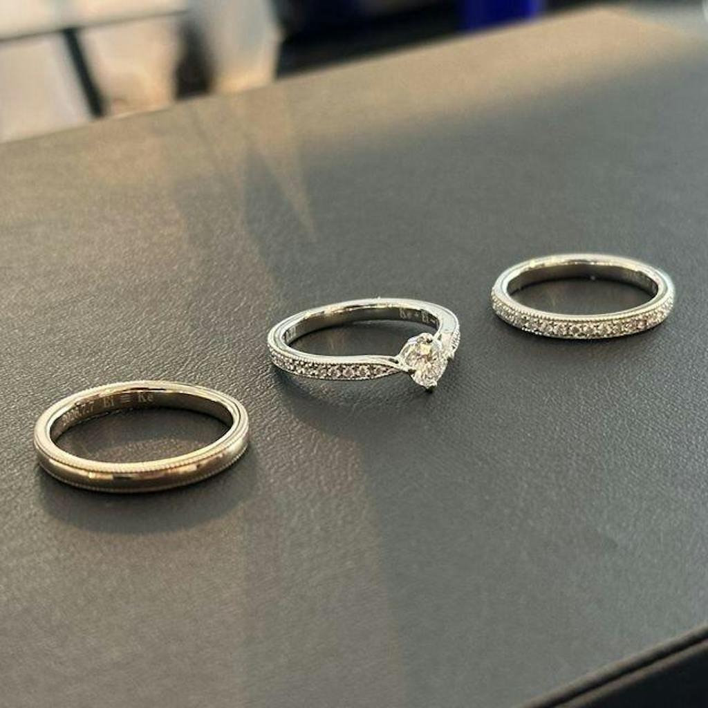 たとえば、メレダイヤ(小さなダイヤ)をあしらった豪華なスタイル ― エタニティリング(ハーフ)や サイドストーンリング― なども、追加料金なしでお作りできます。