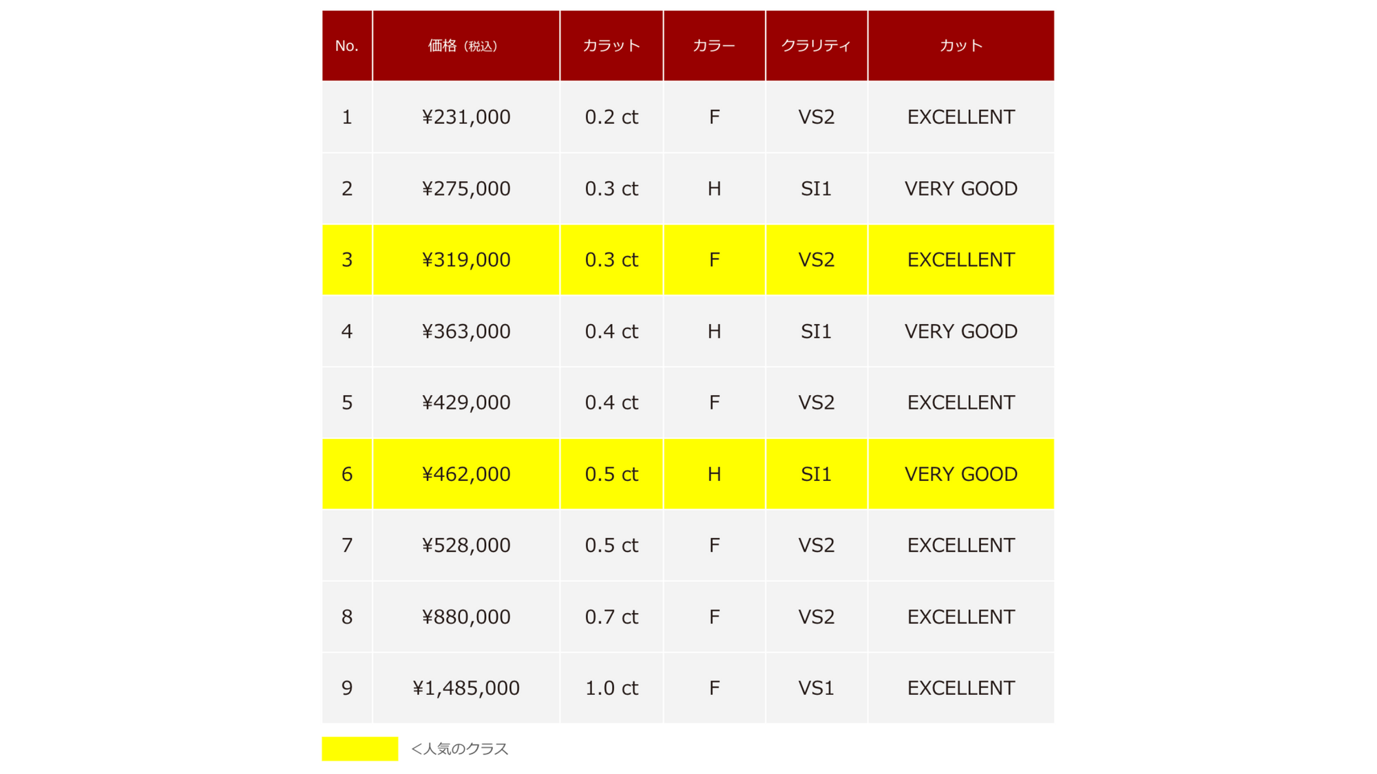 ・品質を大事にしたいけど、No2とNo3は輝きはどの程度違うの?